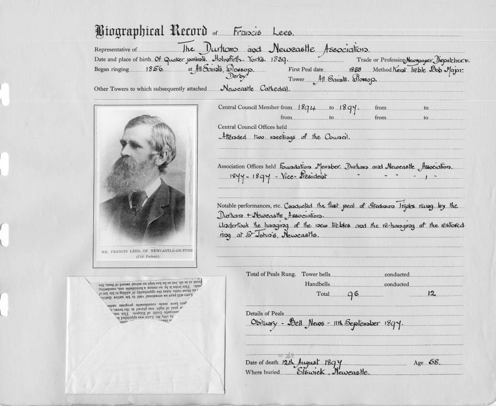Ringing records:Began ringing: 1856 Notable performances: Conducted the first peal of Stedman Triples rung by the Durham & Newcastle association. Undertook the hanging of the new trebles and the re-hanging of the restored ring at St. John's Newcastle. First peal: Kent Treble Bob Major All Saints, Glossop See who Francis Lees rang with Total peals rung: 95 Total peals conducted: 12 |