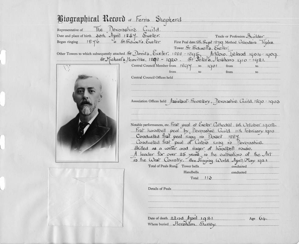 Places:Place of Birth: Exeter Began ringing at: St Sidwell's, Exeter Tower from biographical record etc.: St David's, Exeter 1888-1895; Arklow, Ireland 1904-1909; St Michael's, Heavitree 1898-1920; St Peter's, Hersham 1910-1921 Tower mentioned in obituary: Hersham |
