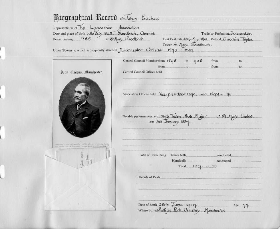 Ringing records:Began ringing: 1858 Notable performances: 10176 Treble Bob Major at St. Mary, Eccles on 3rd January 1887. First peal: Grandsire Triples St. Mary, Sandbach 30/05/1860 Total peals rung: 109 |