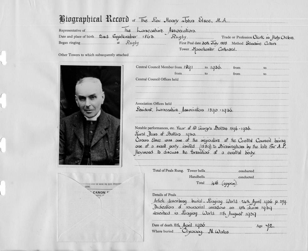 Notable performances: Vicar of St. George's, Bolton 1896-1936 Rural Dean of Bolton 1930 Canon Elsee was one of the originators of the Central Council being one of a small party invited (1889) to Birmingham by the late Sir A. P. Heywood to discuss the formation of a central body. First peal: Grandsire Caters Manchester Cathedral 30/07/1888 Total peals rung: 0 Total peals conducted: 0 |