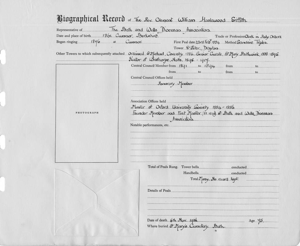 Places:Place of Birth: Cumnor, Berkshire Began ringing at: Cumnor Tower from biographical record etc.: Ordained St. Michael, Coventry1886, Senior Curate, St. Mary, Bathwick 1888-1895, Rector of Winthorpe, Notts 1895-1917 |