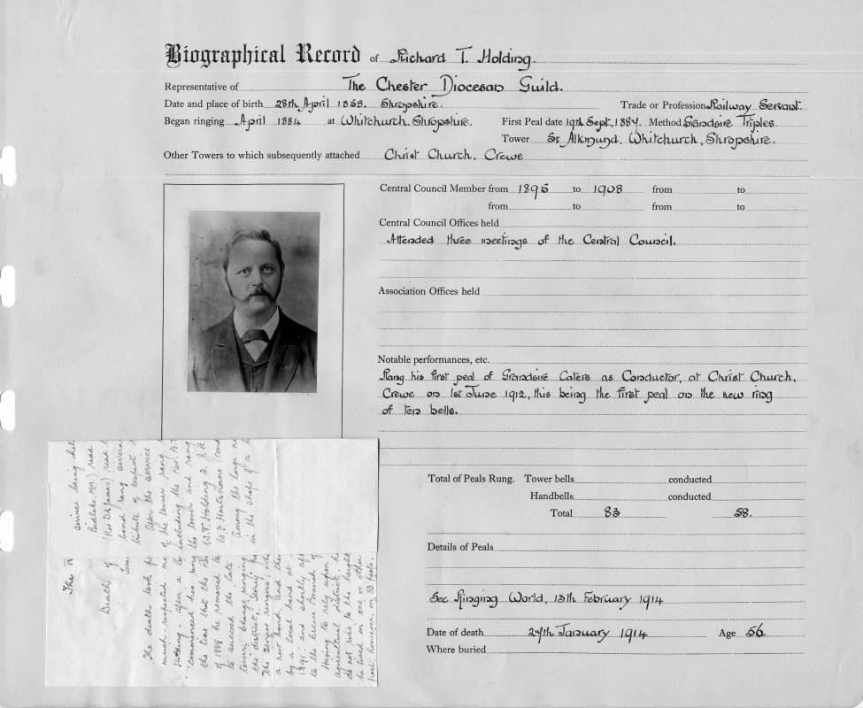 Places:Place of Birth: Shropshire Began ringing at: Whitchurch, Shropshire Tower from biographical record etc.: Christ Church, Crewe Tower mentioned in obituary: Crewe |
