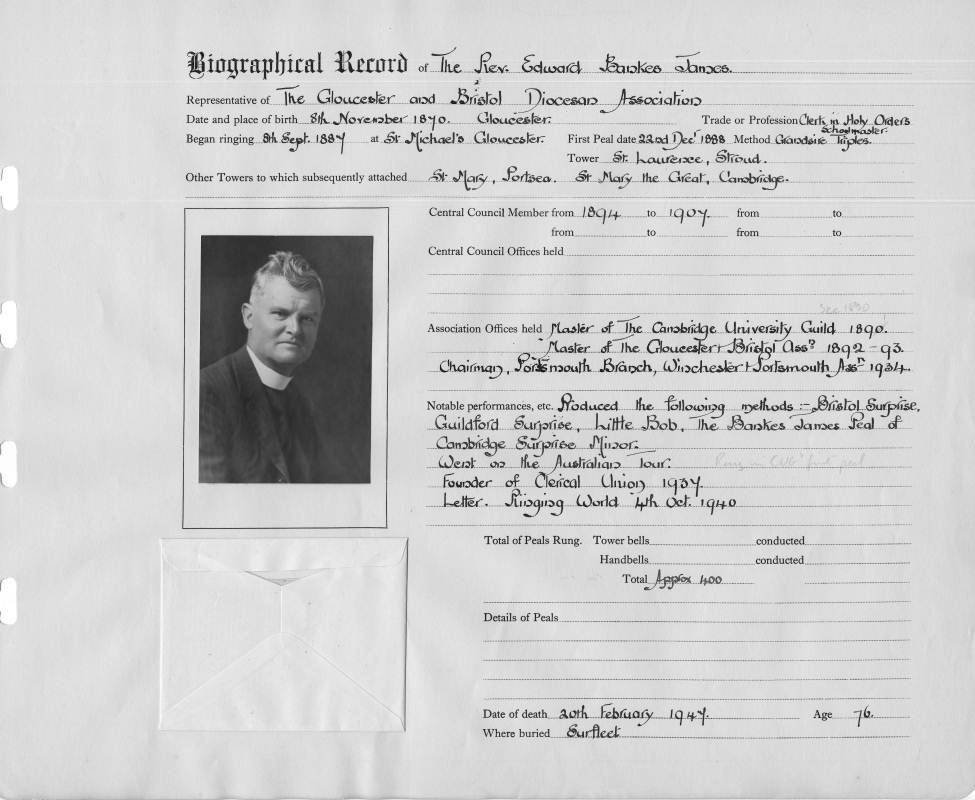 Ringing records:Began ringing: 1887 Notable performances: Produced the following methods:- Bristol Surprise, Guildford Surprise, Little Bob, The Bankes James peal of Cambridge Surprise Minor Went on the Australian tour Founder of Clerical Union 1937 First peal: Grandsire Triples St. Laurence, Stroud 22/12/1888 |