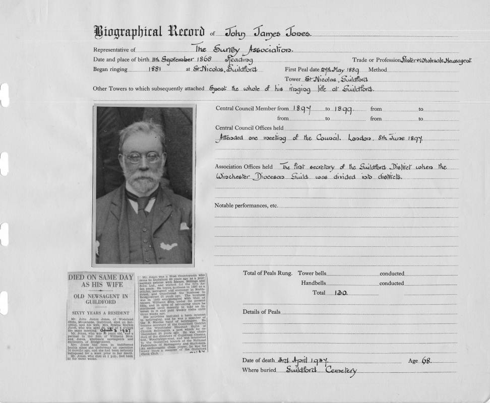 Places:Place of Birth: Reading Began ringing at: St. Nicholas, Guildford Tower mentioned in obituary: Guildford |