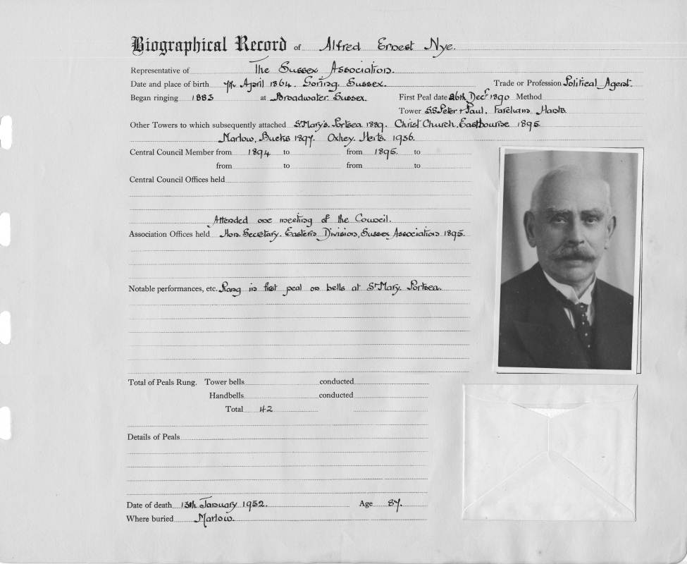 Places:Place of Birth: Goring, Sussex Began ringing at: Broadwater, Sussex Tower from biographical record etc.: St Mary's Portsea 1889.Christ Church, Eastbourne 1895, Marlow, Bucks 1897, Oxhey, Herts 1936 |