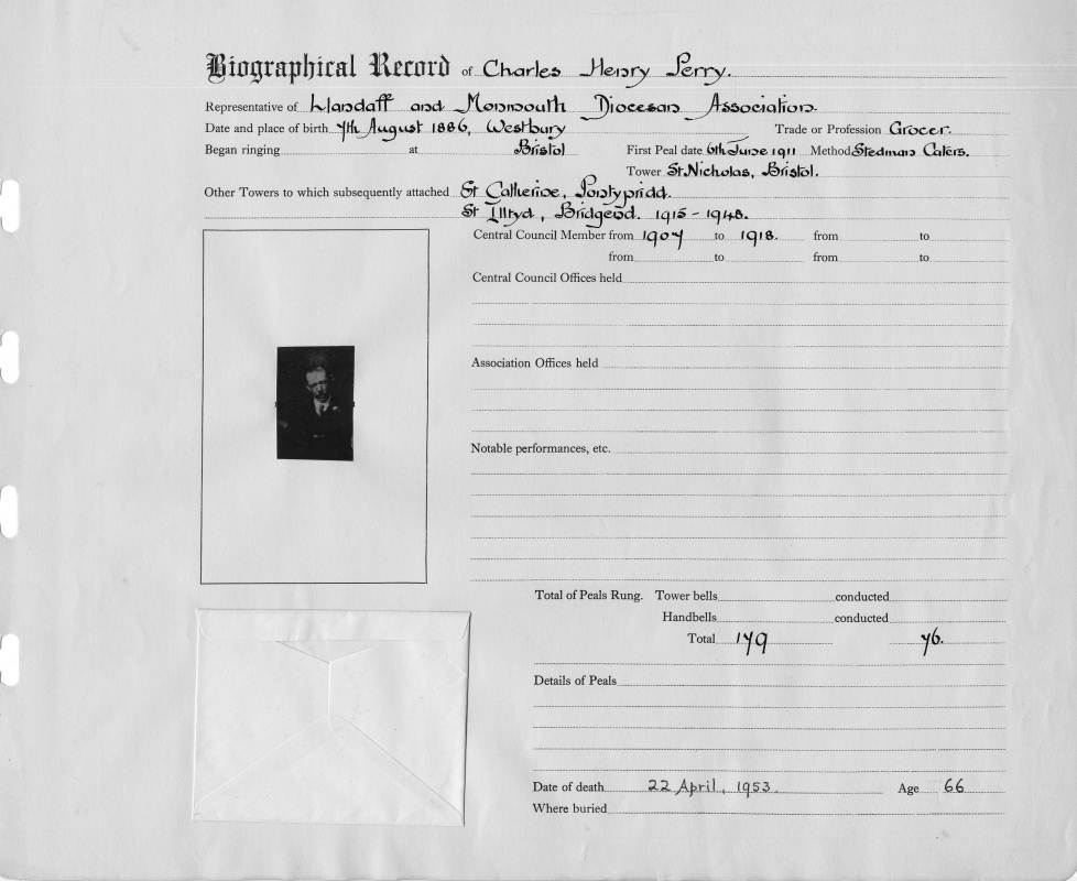 Places:Place of Birth: Westbury Began ringing at: Bristol Tower from biographical record etc.: St.Catherine, Pontypridd, St. Illyd, Bridgend 1915-1948 Tower mentioned in obituary: Bridgend |