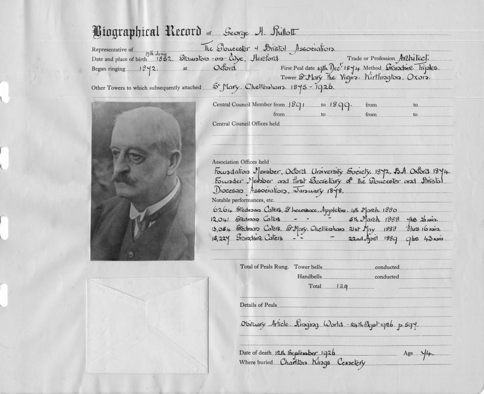 Places:Place of Birth: Staunton-on-Wye, Hereford Began ringing at: Oxford Tower from biographical record etc.: St Mary, Cheltenham 1875-1926 Tower mentioned in obituary: Cheltenham |
