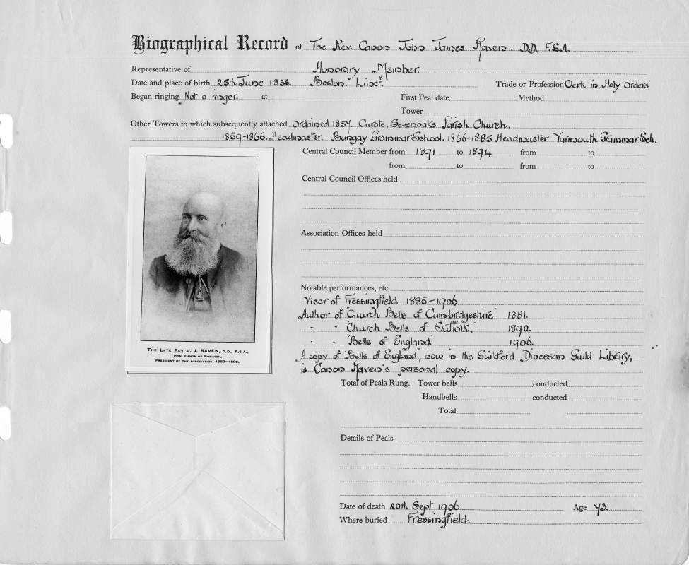 Ringing records:Notable performances: Vicar of Fressingfield 1885-1906 author of 'Church Bells of Cambridgeshire 1881 Church Bells of Suffolk 1890 Bells of England 1906 First peal: Total peals rung: 0 Total peals conducted: 0 |