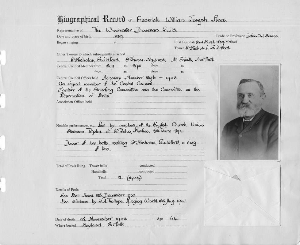 Ringing records:Notable performances: Peal by members of the English Church Union. Stedman Triples at St. John Pimlico 16th June 1894. Details of peals: See Bell News 12th December 1903. also reference by J.A.Trollope, Ringing World 15th Aug 1941. First peal: St. Nicholas, Guildford 02/03/1889 |