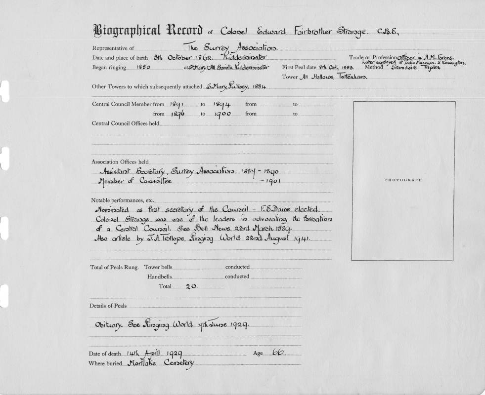 Ringing records:Began ringing: 1880 Notable performances: Nominated as first Secretary of the Council - F. E. Dawe elected. Colonel Strage was one of the leaders in advocating the formation of a Central Council. See Bell News 23rd March 1889, also article by J.A. Trollope, Ringing World 22nd August 1941. First peal: Grandsire Triples All Hallows, Tottenham 08/10/1883 Total peals rung: 20 |