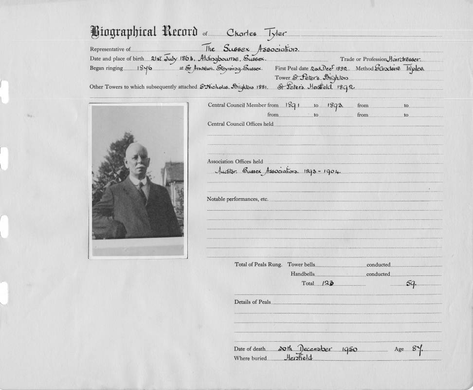 Ringing records:Began ringing: 1876 First peal: Grandsire Triples St. Peter, Brighton 02/12/1882 Total peals rung: 123 Total peals conducted: 59 |