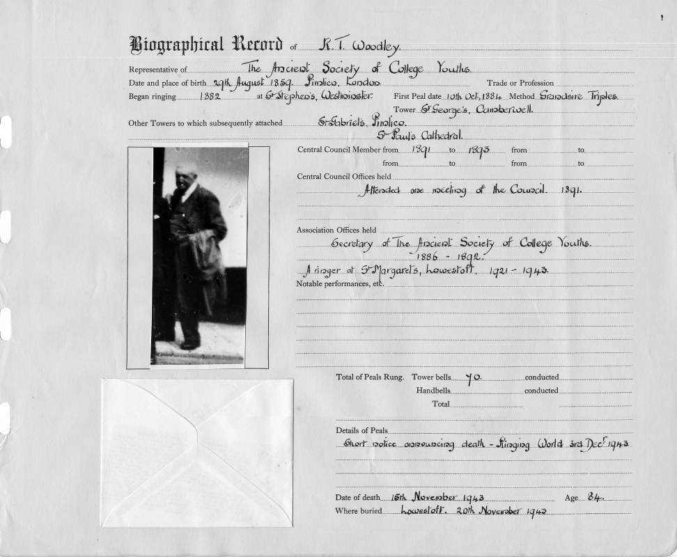 Places:Place of Birth: Pimlico, London Began ringing at: St. Stephen's, Westminster Tower from biographical record etc.: St. Gabriel's, Pimlico, St. Paul's Cathedral, St. Margaret's, Lowestoft 1921-1943 Tower mentioned in obituary: Lowestoft |